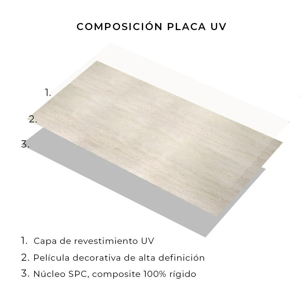 Composición SPC Composite 100% rígido. Incluye polvo de piedra, resinas y aditivos. Incluye capa de revestimiento UV.